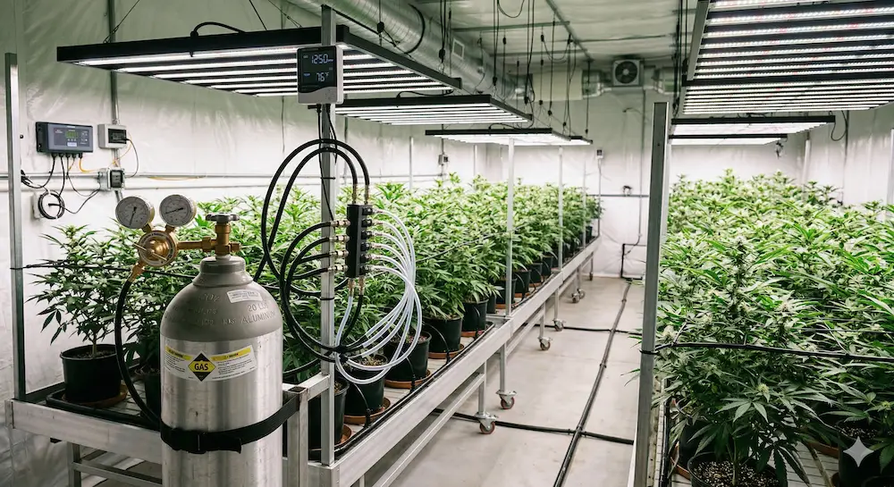 Compressed tanks paired with a regulator and controller are the most precise delivery method for grow tents and small-to-medium rooms. Gas releases in measured, controlled bursts, and the system can be automated to maintain exact PPM setpoints within your target band.