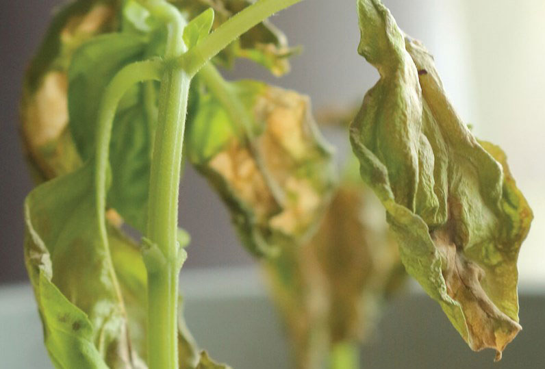 This results in limited water uptake to the leaves and stem. This dehydration causes the plant foliage to turn yellow and die.