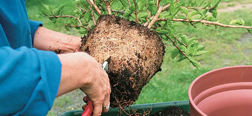 If the roots have formed a solid mass with little soil to be seen, then you may want to prune. This is an important step before putting the plant into a larger container. Some plants can also be divided and repotted into two separate containers.